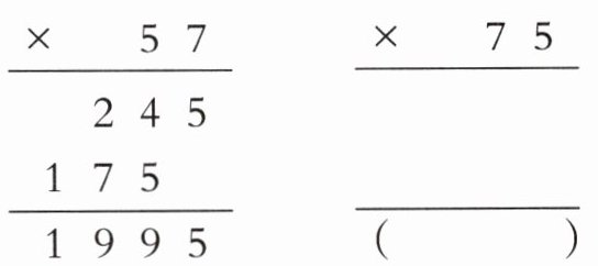 $\begin{array}{r} ×\ \ 57\\ \hline 245\\ 175\ \ \\ \hline 1995\end{array} $ $\begin{array}{r} ×\ \ 75\\ \hline ( )\end{array} $