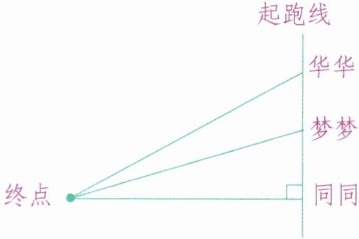 同同跑得最慢。理由:同同的路程最短,在时间相同的情况下,速度最慢。[点拨]从直线外一点到这条直线所画的线段中,垂直线段最短。同同所跑的路程是最短的,跑步时间相同,所以同同跑得最慢。