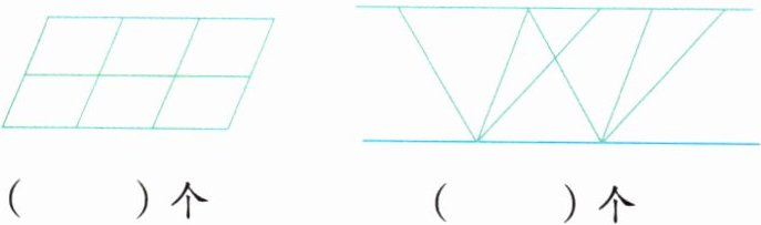 ,单个的:①,②,③,④,⑤,⑥共6个;由两个单个的组合成的:①②,②③,④⑤,⑤⑥,①④,②⑤,③⑥共7个;由三个单个的组合成的:①②③,④⑤⑥共2个;由四个单个的组合成的:①②④⑤,②③⑤⑥共2个;由六个单个的组合成的:①②③④⑤⑥有1个,总计:6 + 7 + 2 + 2 + 1 = 18(个)。第2个图,观察题图,可以发现上下两条平行线之间有3组互相平行且方向不同的线段,所以有3个平行四边形。