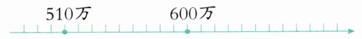 【点拨】通过510万和600万之间有9个小格可得,每个小格代表10万,然后将5500000和6300000转化成用“万”作单位的数,就可以在数线上找到5个数的位置。