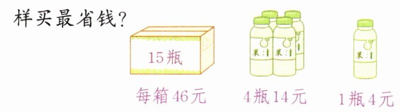答:买2箱15瓶装的和3组4瓶装的最省钱。