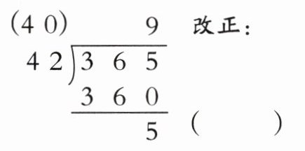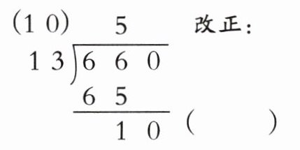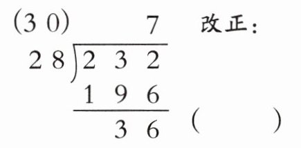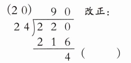 [点拨]列竖式计算三位数除以两位数的注意事项:①要注意被除数的前两位大于除数,商写在十位上;被除数的前两位小于除数,商写在个位上。②计算有余数的除法时,余数一定要小于除数。③余数不够除时,商的个位要商0占位。④商一定要和原除数相乘,不能和试商用的整十数相乘。