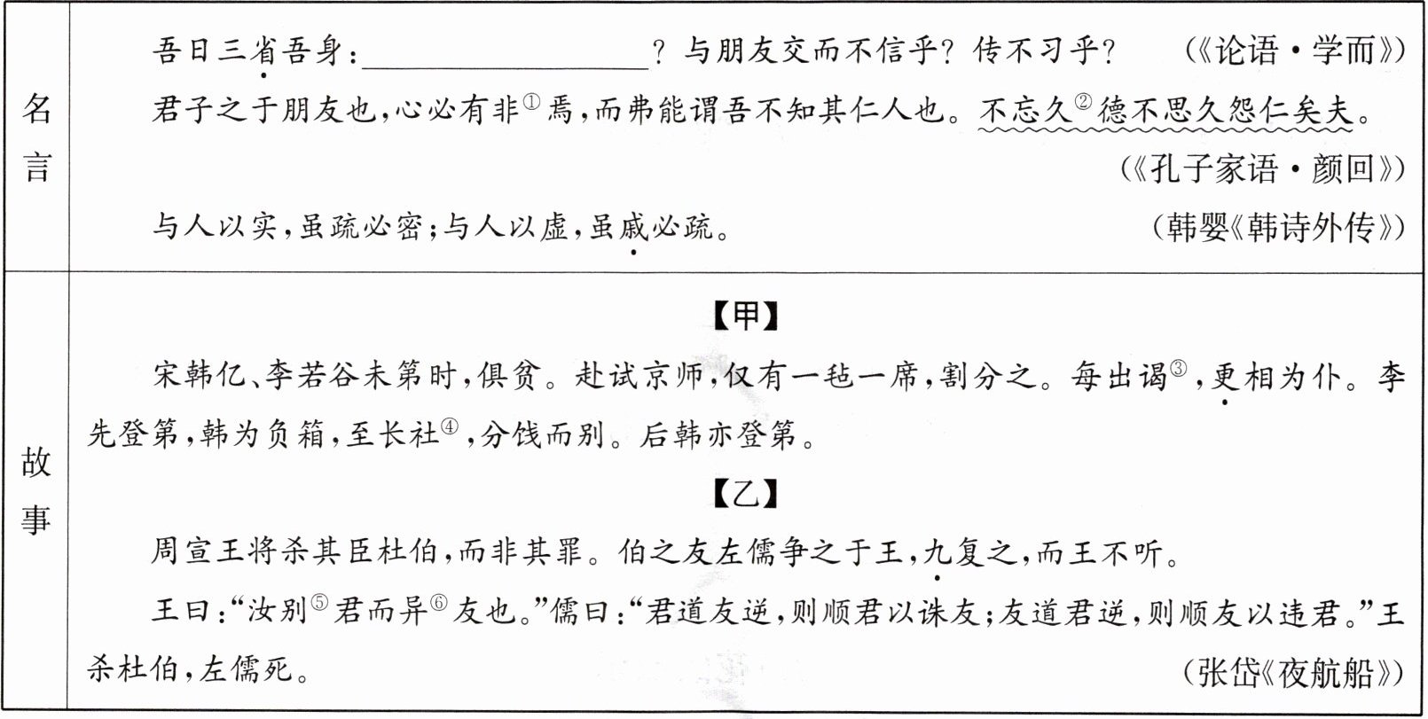 |名言|吾日三省吾身:______?与朋友交而不信乎?传不习乎?(《论语·学而》)君子之于朋友也,心必有非①焉,而弗能谓吾不知其仁也。不忘久②德不思久怨仁矣夫。(《孔子家语·颜回》)与人以实,虽疏必密;与人以虚,虽戚必疏。(韩婴《韩诗外传》)|