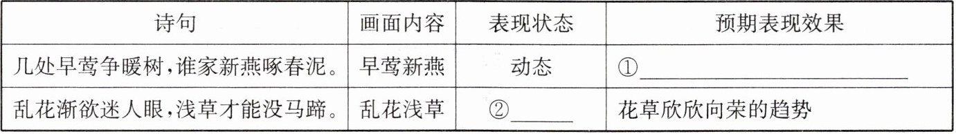 | 几处早莺争暖树,谁家新燕啄春泥。 | 早莺新燕 | 动态 | ①______|