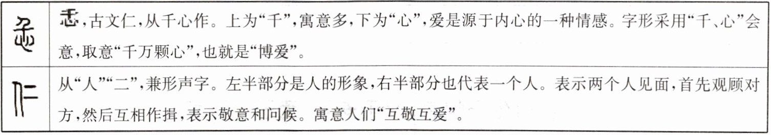 |仁|从“人”“二”,兼形声字。左半部分是人的形象,右半部分也代表一个人。表示两个人见面,首先光顾对方,然后互相作揖,表示敬意和问候。寓意人们“互敬互爱”。| ____