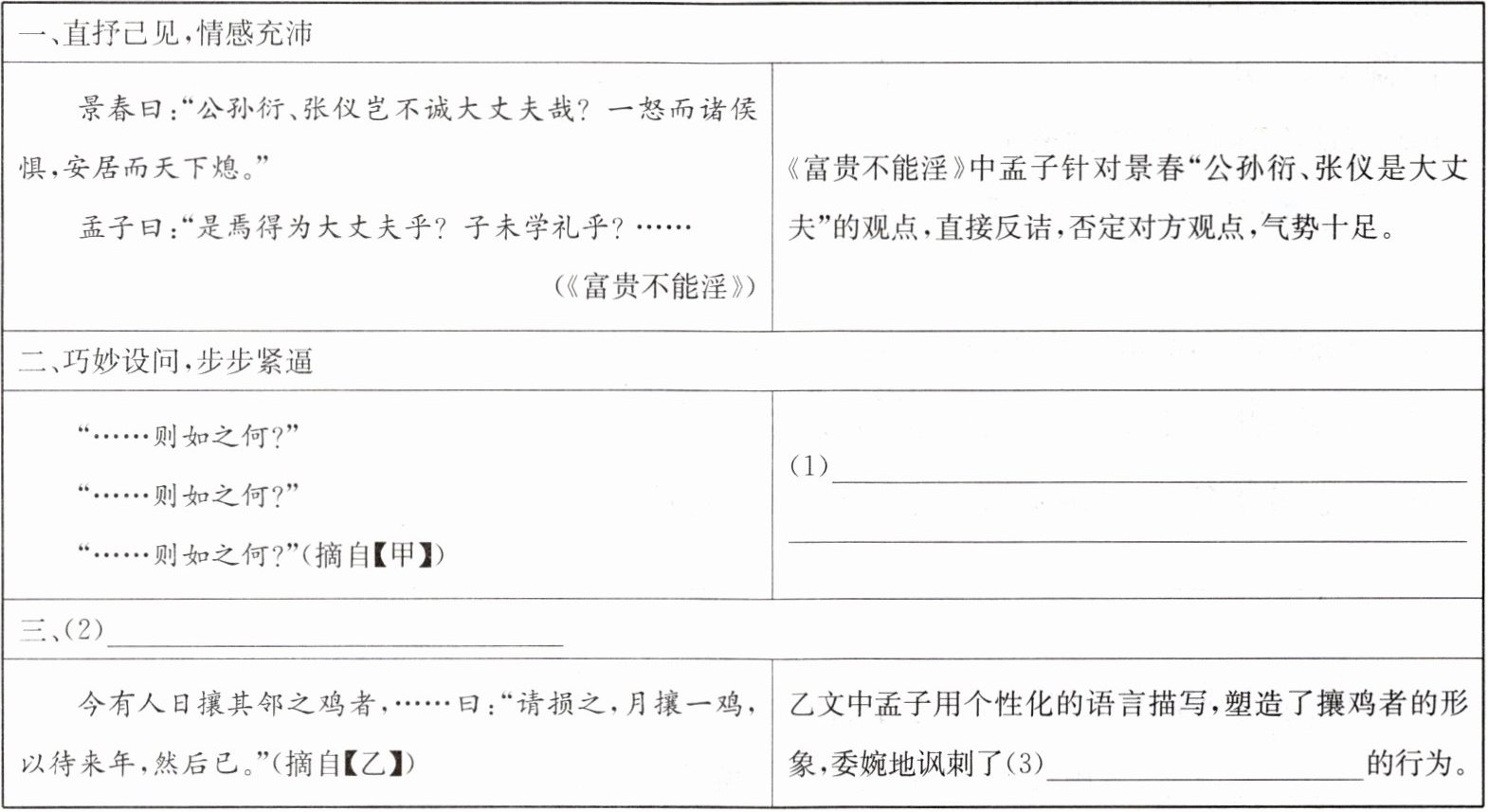 《富贵不能淫》中孟子针对景春“公孙衍、张仪是大丈夫”的观点,直接诘诘,否定对方观点,气势十足。
