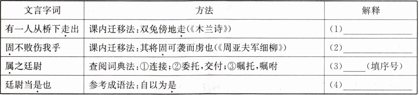 |有一人从桥下走出|课内迁移法:双兔傍地走(《木兰诗》)|(1)______|