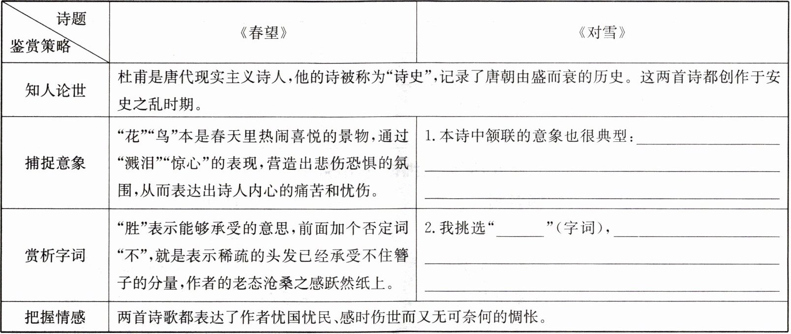|鉴赏策略|知人论世|杜甫是唐代现实主义诗人,他的诗被称为“诗史”,记录了唐朝由盛而衰的历史。这两首诗都创作于安史之乱时期。|