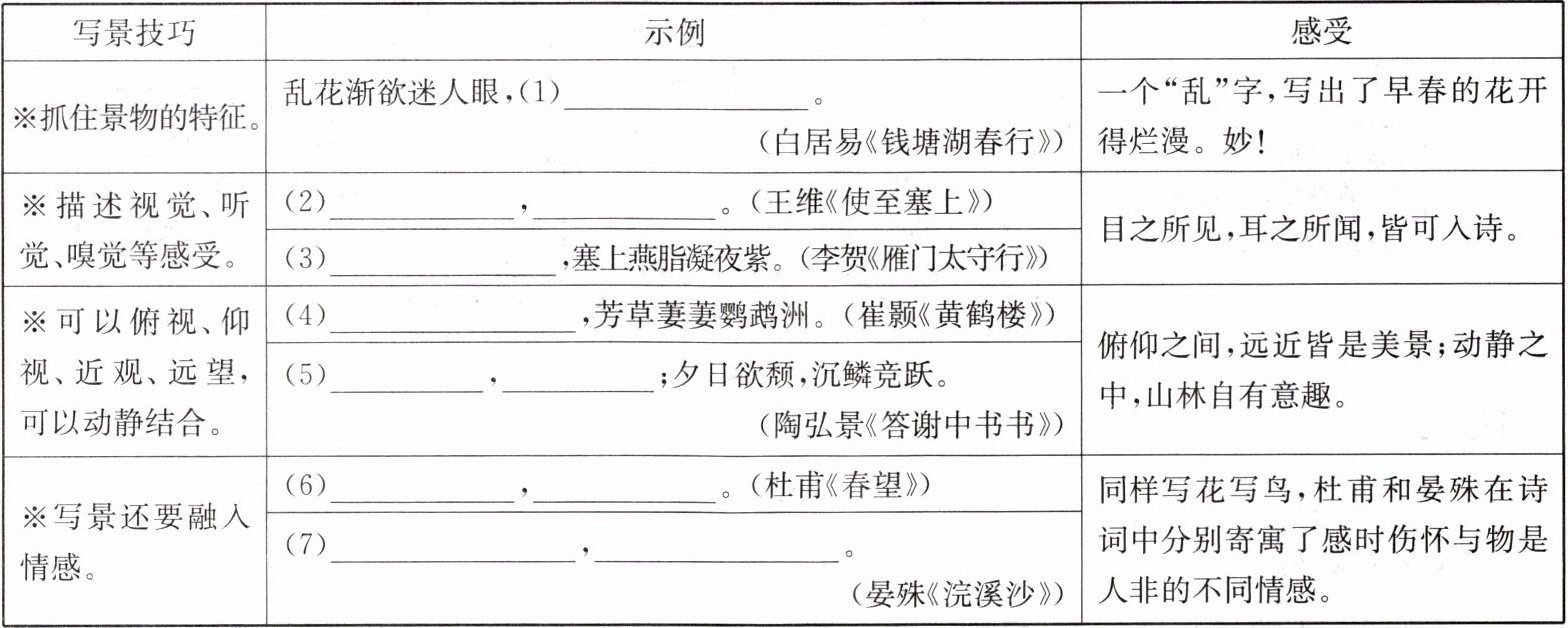 | ※写景还要融入情感。 | (6)______,______。(杜甫《春望》) | 同样写花写鸟,杜甫和晏殊在诗词中分别寄寓了感时伤怀与物是人非的不同情感。 |