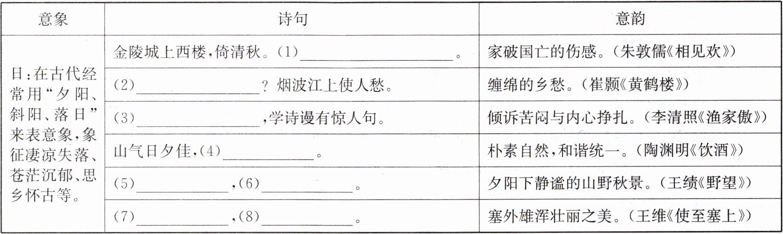| 日:在古代经常用“夕阳、斜阳、落日”来表意象,象征凄凉失落、苍茫沉郁、思乡怀古等。 | 金陵城上西楼,倚清秋。(1)______。(朱敦儒《相见欢》) | 家破国亡的伤感。 |