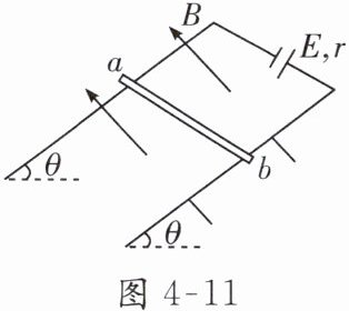 7. 如图 4 - 11,两平行金属导轨间的距离 $ L = 0.4 m $,金属导轨所在的平面与水平面夹角 $ \theta = 37^{\circ} $,在导轨所在平面内分布着磁感应强度 $ B = 0.5 T $、方向垂直于导轨所在平面的匀强磁场。金属导轨的一端接有电动势 $ E = 4.5 V $、内阻 $ r = 0.5 \Omega $ 的直流电源。现把一个质量 $ m = 0.04 kg $ 的导体棒 $ ab $ 放在金属导轨上,导体棒恰好静止。导体棒与金属导轨垂直且接触良好,导体棒与金属导轨接触的两点间的电阻 $ R_0 = 2.5 \Omega $,金属导轨电阻不计,$ g $ 取 $ 10 m/s^2 $。已知 $ \sin 37^{\circ} = 0.6 $,$ \cos 37^{\circ} = 0.8 $,求: