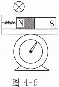 4. (多选)如图 4 - 9,台秤上放一光滑平板,其左边固定一挡板,一轻质弹簧将挡板和一条形磁体连接起来,此时台秤读数为 $ F_1 $,现在磁体上方中心偏左位置固定一导体棒,当导体棒中通以方向如图的电流后,台秤读数为 $ F_2 $,则以下说法正确的是( )。