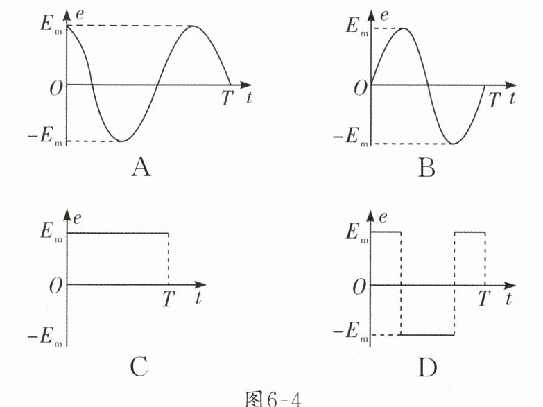 【典例1】图6-3所示是一台发电机的结构示意图,其中N、S是永久磁体的两个磁极,它们的表面呈半圆柱面形状. M是圆柱形铁芯,它与磁极的柱面共轴,铁芯上有一矩形线框,可绕与铁芯M共轴的固定转动轴旋转. 磁极与铁芯之间的缝隙中形成方向沿半径、大小近似均匀的磁场. 若从图示位置开始计时,当线框绕固定转动轴匀速转动时,图6-4中能正确反映线框中感应电动势$e随时间t$变化规律的是(