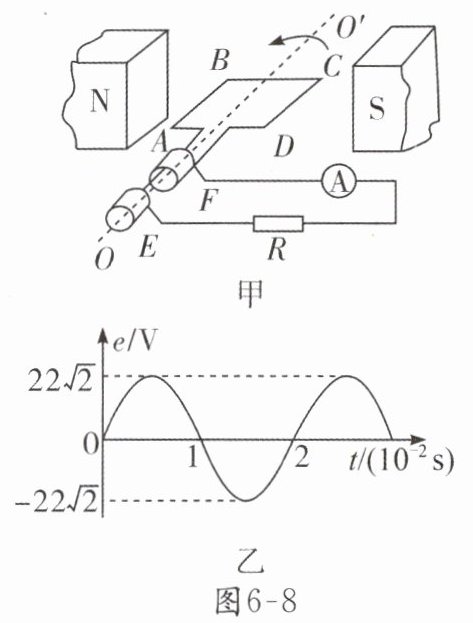 3. 图6-8甲是小型交流发电机的示意图,两磁极N、S间的磁场可视为水平方向的匀强磁场,A为理想交流电流表. 线圈绕垂直于磁场的水平轴$OO'$沿逆时针方向匀速转动,产生的电动势随时间变化的图像如图6-8乙所示. 已知发电机线圈电阻为$10\Omega$,外接一只阻值为$90\Omega$的电阻,不计电路的其他电阻,则(