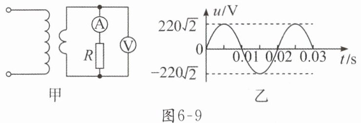 4. (多选)图6-9甲左侧的调压装置可视为理想变压器,负载电路中$R = 110\Omega$,A、V为理想电流表和电压表. 若原线圈接入图6-9乙所示的正弦式交变电压,电压表的示数为110V,下列表述正确的是(