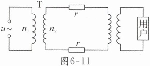 6. 图6-11所示为远距离输电示意图,两变压器均为理想变压器,升压变压器T的原、副线圈匝数分别为$n_{1}$、$n_{2}$. 在T的原线圈两端接入一电压$u = U_{m}\sin\omega t$的交流电源,若输送电功率为$P$,输电线的总电阻为$2r$,不考虑其他因素的影响,则输电线上损失的电功率为(