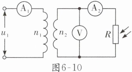 5. (多选)如图6-10所示,$R$是一个光敏电阻,其阻值随光照强度的增加而减小. 理想变压器原、副线圈的匝数比为$10:1$,电压表和电流表均为理想交流电表,从某时刻开始在原线圈两端加上交变电压,其瞬时值表达式为$u_{1}= 220\sqrt{2}\sin100\pi t(V)$,则(