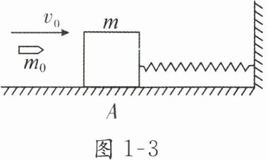 1. 如图 1 - 3 所示,质量为$m$的木块位于光滑水平地面上,木块与墙用水平轻弹簧连接,开始时木块静止在$A$位置. 现有一质量为$m_{0}的子弹以水平速度v_{0}$射向木块并嵌入其中,则当木块回到$A位置时的速度v的大小及此过程中墙对弹簧的冲量I$的大小分别为(