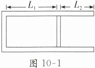 【典例2】如图10-1所示,水平放置的汽缸内封闭一定质量的理想气体,活塞的质量$m = 10kg$,横截面积$S = 100cm^{2}$,活塞可沿汽缸壁无摩擦滑动且不漏气,活塞到汽缸底部的距离$L_{1} = 11cm$,到汽缸口的距离$L_{2} = 4cm$. 现将汽缸缓慢地转到开口向上的竖直位置,待稳定后对缸内气体逐渐加热,使活塞上表面刚好与汽缸口相平. 已知$g = 10m/s^{2}$,外界气温为$27^{\circ}C$,大气压强为$1.0×10^{5}Pa$,活塞厚度不计,则: