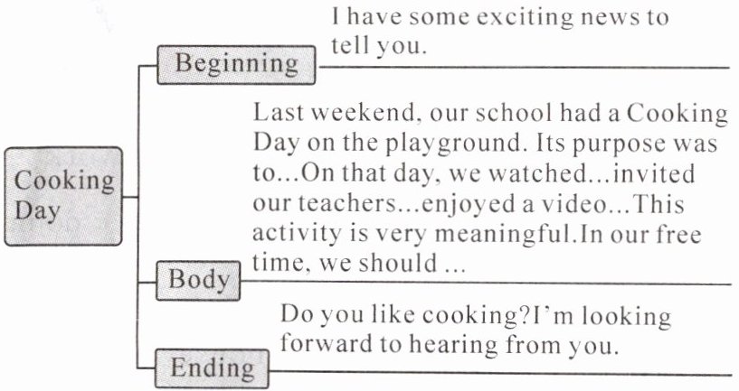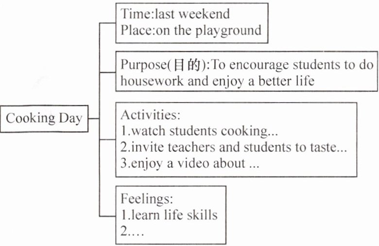 Last weekend, our school had a Cooking Day on the playground. Its purpose was to...On that day, we watched...invited our teachers...enjoyed a video...This activity is very meaningful. In our free time, we should...