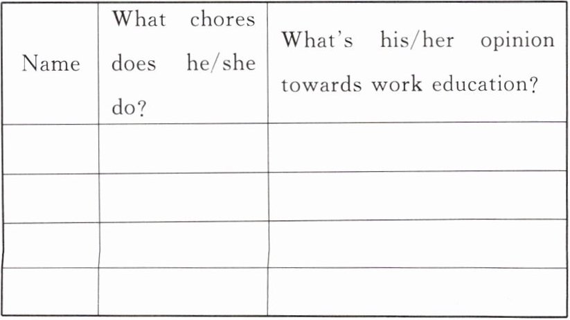 Task 1: Labour can not only help us improve our life skills but also create a better life. What chores do you usually do at home? What do you think of work education? Make a survey among your classmates and fill in the form.