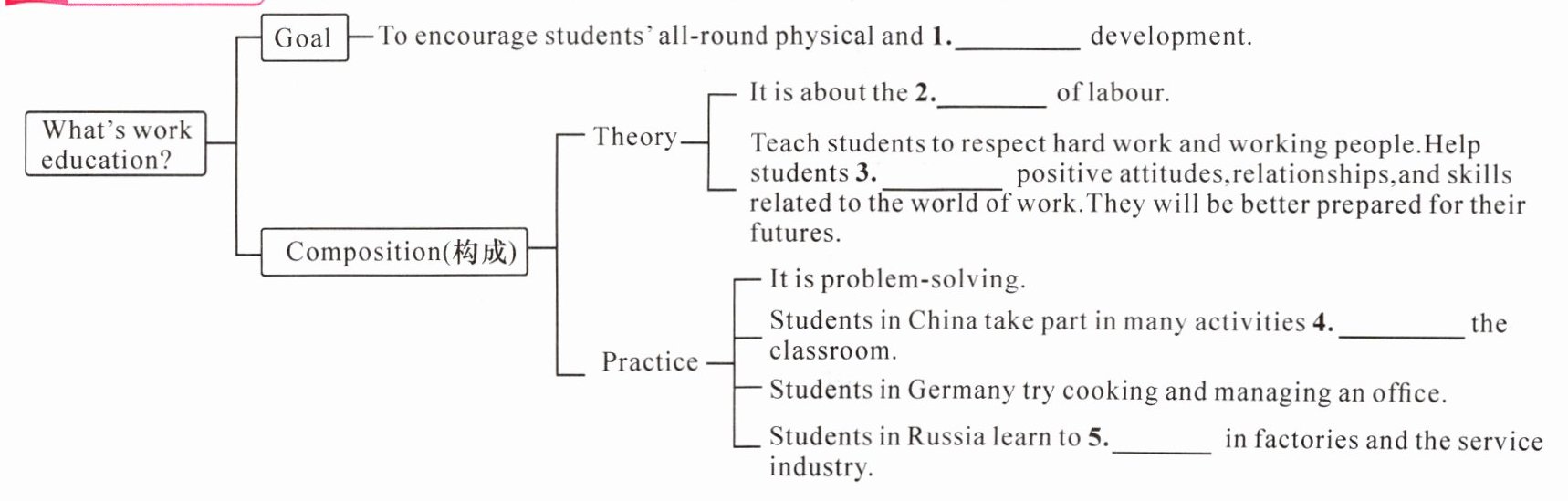 4. 【教材原句】In Russia, work education focuses on the connection between education and productive work. 在俄罗斯,劳动教育专注于教育与生产性工作之间的联系。