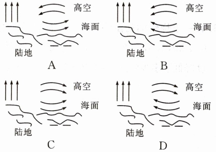 10. 新考向 日常生活 夏日晴朗的白天,在太阳光照射下,某海边城市陆地与海面之间空气流动示意图(图中箭头表示空气流动方向),其中合理的是(