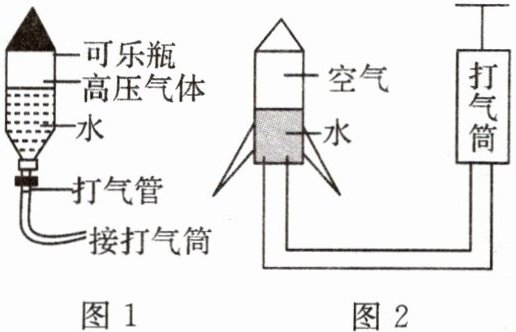 10. 某校科技节上,如图1为物理老师自制的水火箭结构示意图。如图2为使用打气筒向水火箭内不断打气示意图,当水面上方压强增大到一定程度时,会使水向下喷出,从而使水火箭升空。结合材料,你认为以下说法错误的是(