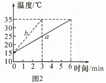 (3)根据实验数据,小华作出了$a$、$b$两种液体的温度随加热时间变化的图像(如图2所示)。分析图像可知,升高相同的温度,