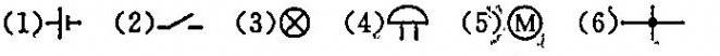 (1) 电池:;(2) 断开状态的单刀单掷开关:;(3) 电灯:;(4) 电铃:;(5) 电动机:;(6) 交叉连接的导线:。