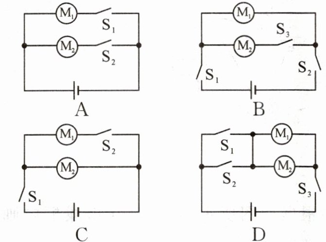 9. 超市人口有两个通道,当人走近任何一个通道时,开关自动闭合,在电动机带动下,只有该通道门打开。以下电路中符合要求的是(