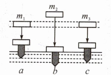 13. 用“模拟打桩”实验来探究物体重力势能的大小与哪些因素有关,物体的质量$m_1 = m_2 < m_3$。实验时,让物体从木桩正上方的某一高度处自由下落,将木桩打入沙中,三次实验木桩进入沙中的深度如图所示,木桩进入沙中的深度越深,则物体对木桩做的功越