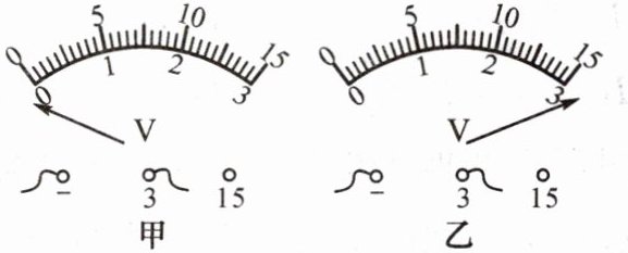 4. 小明在使用电压表测量电压的过程中,指针的偏转出现了如图所示的两种现象,请你指出其中的原因。