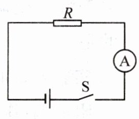 4. 在如图所示的电路中,电阻 $ R $ 的阻值为 $ 10 \Omega $,闭合开关 $ S $,电流表的示数为 $ 0.9 A $。