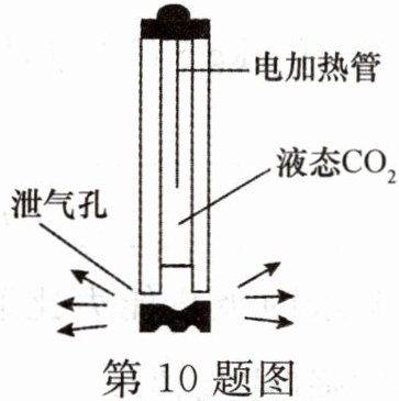 10. (2024·山西)二氧化碳(CO₂)爆破技术是现代工程建设中非常环保的技术,起爆前高压泵将CO₂压缩成高压气体,液化后输入爆破筒内。如图所示,爆破时电加热管发热。使筒内的液态CO₂迅速汽化,形成的高压气体从泄气孔中喷出,实施爆破。下列说法正确的是(
