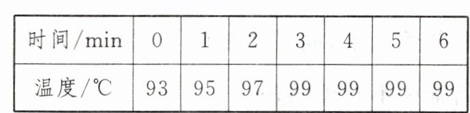 (2)当水温升高到 $ 93^{\circ}C $ 时,每隔 $ 1 \min $ 记录一次温度填入表格,同时观察水中发生的现象。