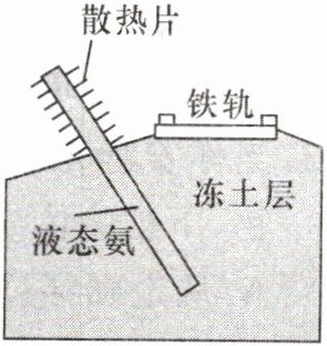 19. (2024·潍坊)为保证青藏铁路多年冻土区路基的稳定性,铁路两侧安装了许多封闭的中空热棒。如图所示,热棒下端插在冻土中,内部填充低沸点的液态氨,利用氨的物态变化给冻土降温,把冻土中的热量“搬运到”热棒上端,通过散热片向空中放热,从而使冻土保持稳定。下列说法正确的是(
