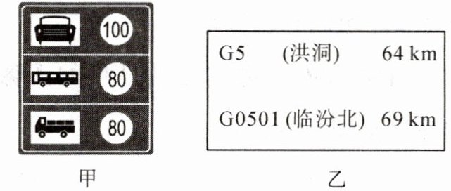 (2) 在回程途中经过 G5 高速公路,某处竖立了两块交通牌,如图甲和乙所示,请根据交通牌的含义计算,在遵守交通规则的前提下,小明所乘的大巴车从标示牌到洪洞最快需要多少小时?
