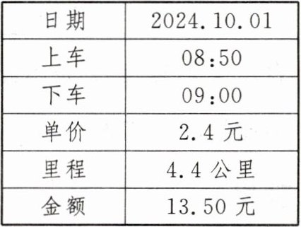 (1)解:由表可知,出租车行驶的总时间:$t=9:00-8:50=10min=\frac{1}{6}h$出租车的速度:$v=\frac{s}{t}=\frac{4.4km}{\frac{1}{6}h}=26.4km/h$