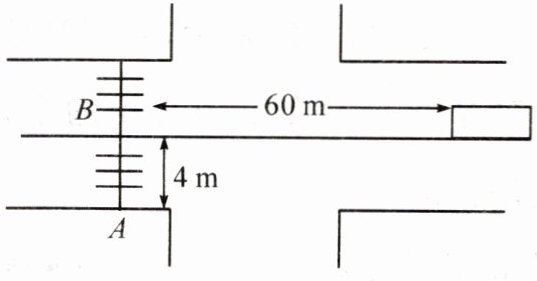 15. 在如图所示的十字路口处,有一辆长 10 m、宽 2.2 m 的客车正以 10 m/s 的速度匀速行驶在马路中间,当它与斑马线 AB 相距 60 m 时,马路边上的小王同学正好在斑马线 A 点以 1.2 m/s 的速度穿过马路,客车行驶到斑马线所需时间为