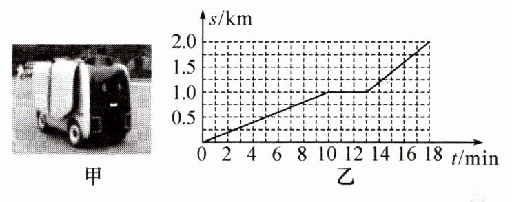 2. 无人快递派送车已应用于很多大学城,如图甲所示,该车从快递驿站出发,$ 10 \, min $ 后到第一个派送点停靠并派送快递,完成任务后再次出发开往下一个派送点,其路程 $ s $ 与时间 $ t $ 的关系如图乙所示。则下列说法正确的是( )