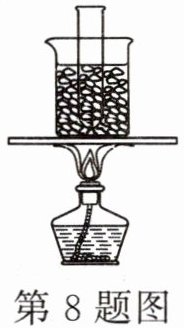 8. 把盛有碎冰块的大试管插入烧杯里的碎冰块中,如图所示。用酒精灯对烧杯底部慢慢加热,当烧杯中的冰块有大半熔化时,试管中的冰(