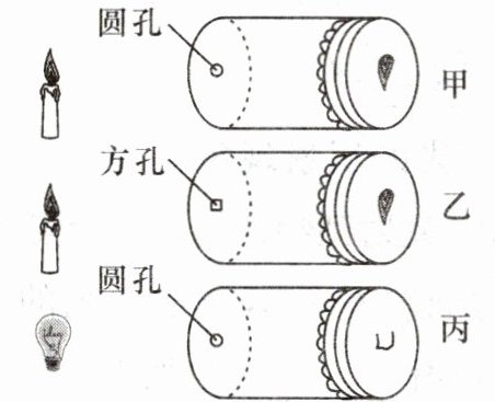 13. 小明探究小孔成像的装置如图所示,他给两个空罐的底部中央分别打上一个圆孔和一个方孔,再用两片半透明的塑料膜蒙在空罐的口上,分别将孔对着烛焰和灯丝,可以看到烛焰和灯丝通过小孔所成的像。