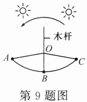 9. 如图所示,在水平地面上的 O 点竖立一根木杆,从早晨到傍晚,木杆的影子从图中的 OA 处运动到 OC 处,则 C 点在 O 点的(
