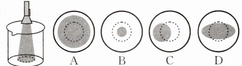 10. 如图所示,一束光照射到一个空的烧杯的底部,形成的光圈用虚线表示,若往烧杯中注满水,烧杯底部的光圈会变为 ()
