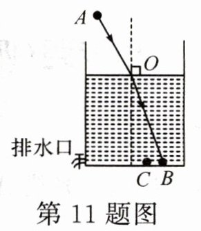 11. 如图,一束光从 A 点射向水面上的 O 点,照射到容器底部的 B 点,如果要让折射光线射到 C 点,应保持入射点不变,
