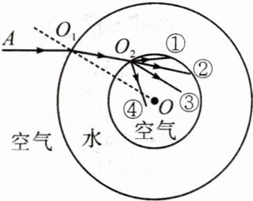 15. 在天宫课堂中,航天员王亚平将空气注入水球,形成的气泡球与水球的球心都在 O 点。一束光从空气射入水球的光路如图所示,其中球心 O 与入射点 O₁ 的连线为法线。则进入气泡球的折射光线可能为 (
