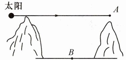 5. 小明外婆家所在的小山村被群山包围,难以获得阳光照射。小明想在A处安装一个大大的平面镜,反射太阳光照亮村子中心的B处。太阳位于图中所示位置时,在图中画出反射光线,并根据光的反射定律在A处画出平面镜(保留作图痕迹)。