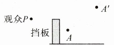 8. (2023·黄冈)“仙女飞天”魔术表演中,位于P点的观众看到云雾中曼舞的仙女$A'$,实质是挡板后的演员A在平面镜中的虚像,如图所示。请作出平面镜的位置,并完成P点观众看到仙女的光路图。