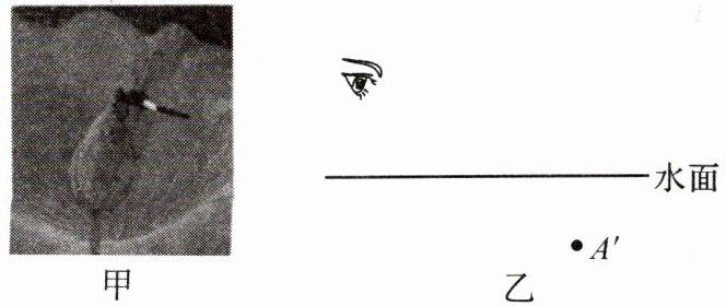 4. (2023·山西)古诗词是中华文化的瑰宝,“小荷才露尖尖角,早有蜻蜓立上头”描述的画面如图甲所示。请在图乙中画出光从蜻蜓经水面反射后进入人眼的光路图,其中A'点表示水中“蜻蜓”的位置。